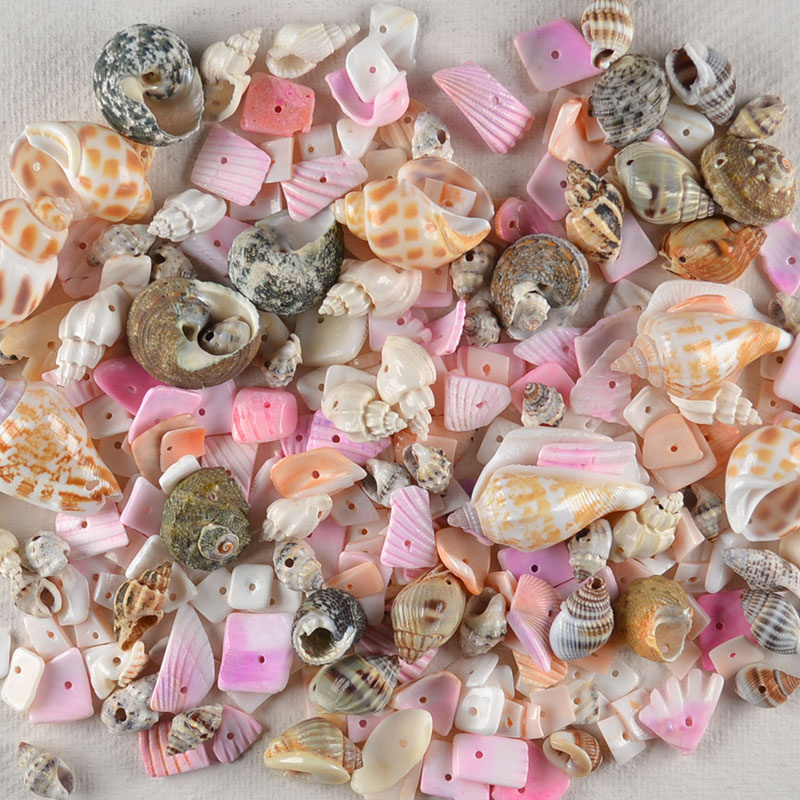 Een gevarieerde mix van schelpkralen in verschillende vormen, kleuren en formaten. Deze restpartij bestaat uit losse en overgebleven kralen, waardoor de samenstelling uniek is.