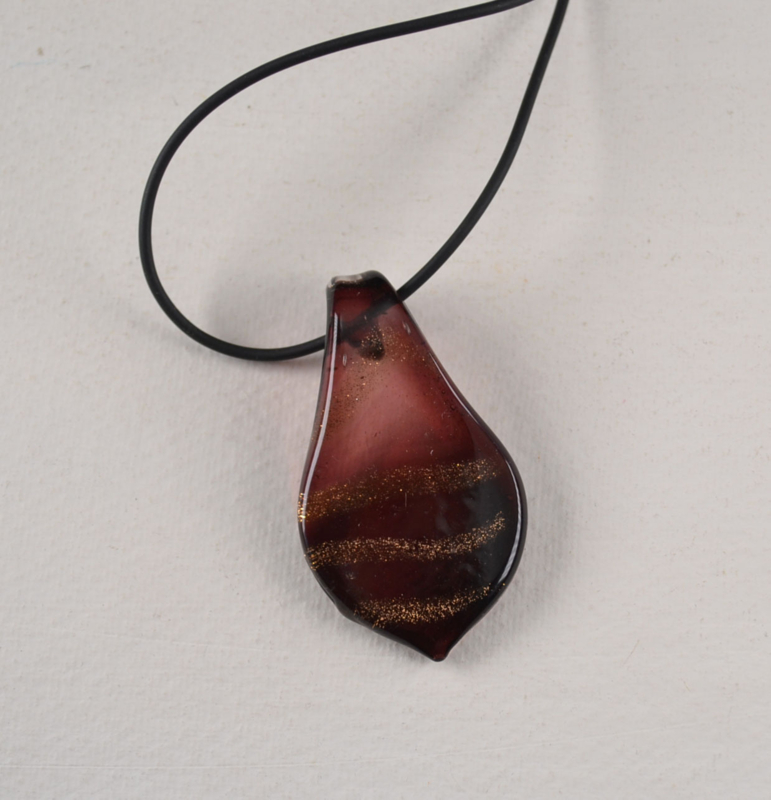 Opvallende glazen hanger in warme aubergine tinten met een subtiele glans. De hanger hangt aan een zwart leren koordje dat je zelf op de gewenste lengte kunt knopen.
