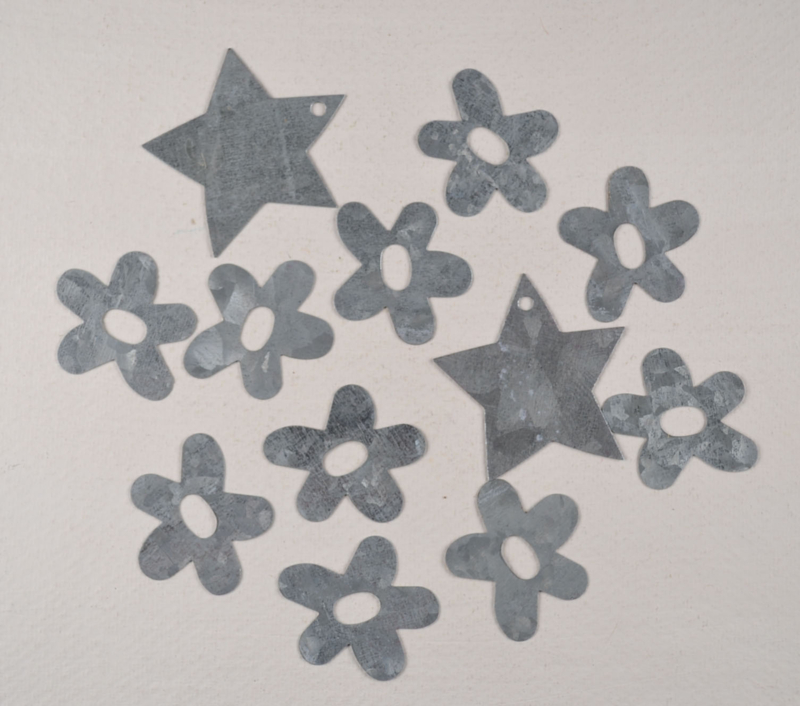 Gemengde set met zinken figuurtjes in de vorm van bloemen en sterren. Leuk om te gebruiken voor decoratie, hobbyprojecten of als klein accent bij een landelijk of creatief geheel.