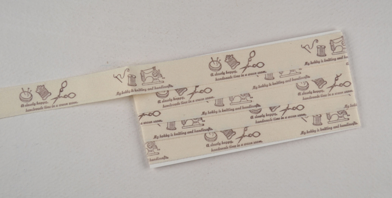 Decoratief plaklint met handwerkprint in zachte naturel tinten. Op het lint staan afbeeldingen van onder andere een naaimachine, schaar, garen en speldenkussen.