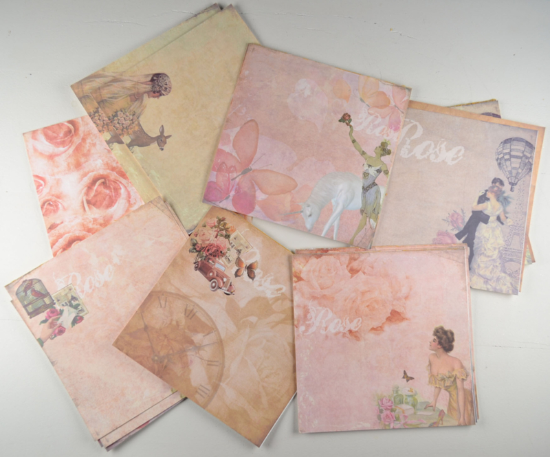 Set met 41 vellen designpapier in romantische vintage stijl. De vellen hebben verschillende dessins in zachte roze, beige en crème tinten, met onder andere rozen, vlinders, dames, klokdetails en andere sfeervolle prints. Mooi voor kaarten maken, scrapbooking, journaling en andere creatieve projecten.