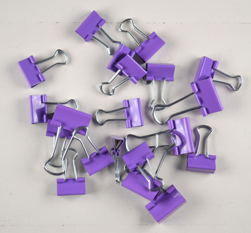 Set van 20 paarse papierklemmen in 2 formaten. Handig voor papier, kaartjes, foto's of kleine hobbyprojecten. Een leuke en praktische op=op-mix voor thuis, school of creatief gebruik.
